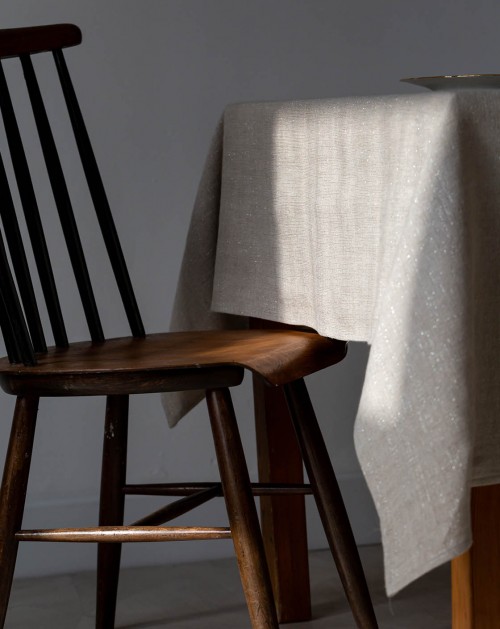 Une très jolie nappe 100% lin tissée avec un fil lurex argent (brillant).